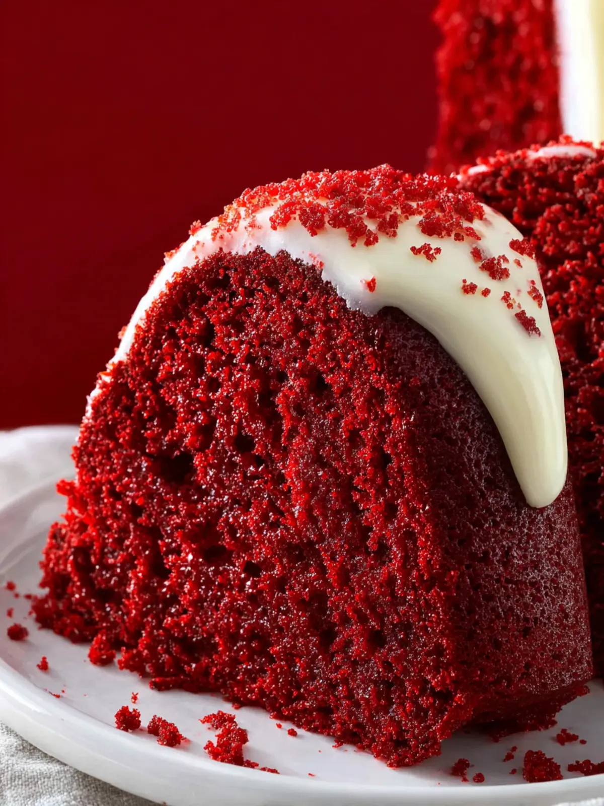 A delightful and moist red velvet bundt cake topped with creamy icing.